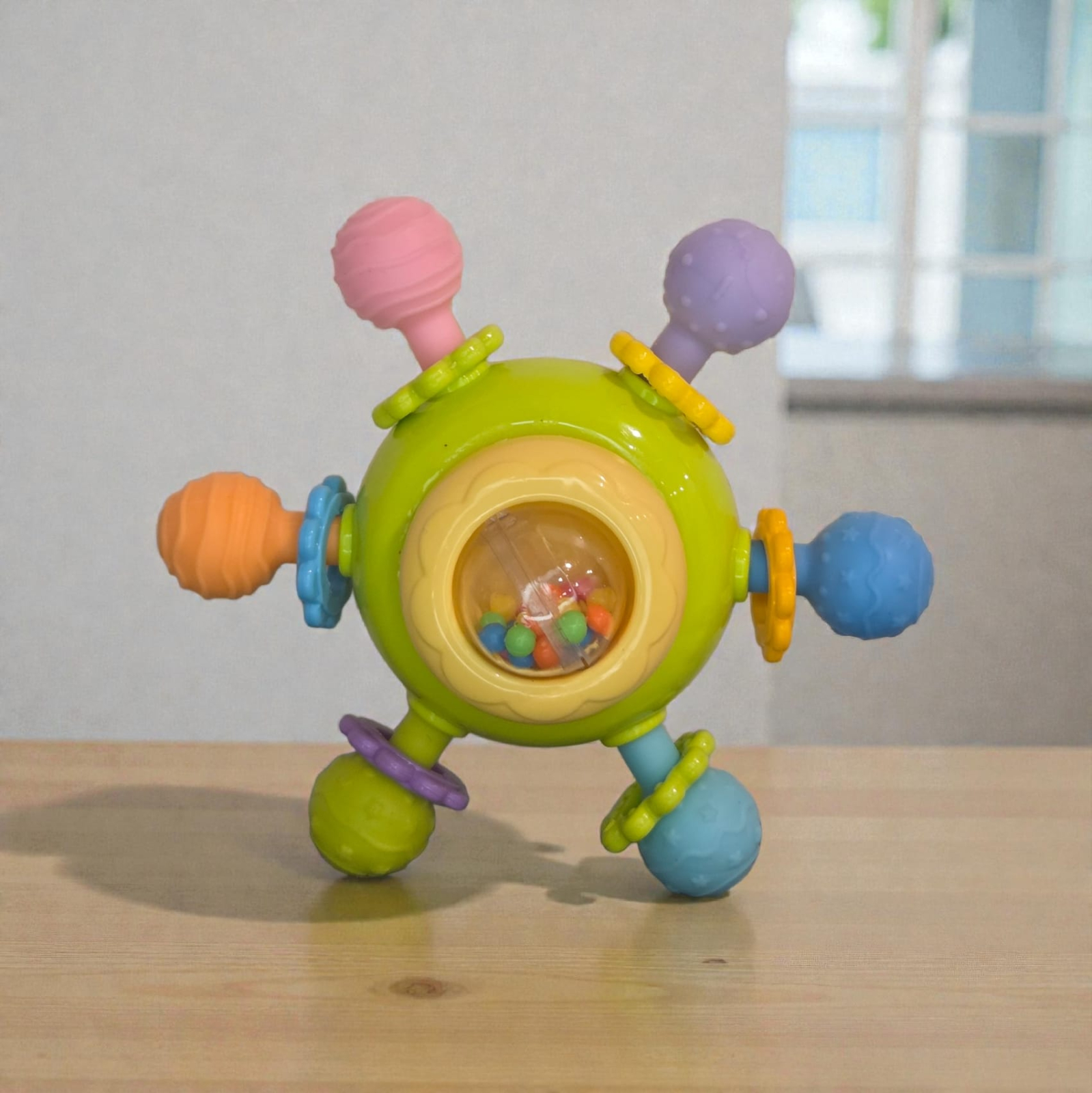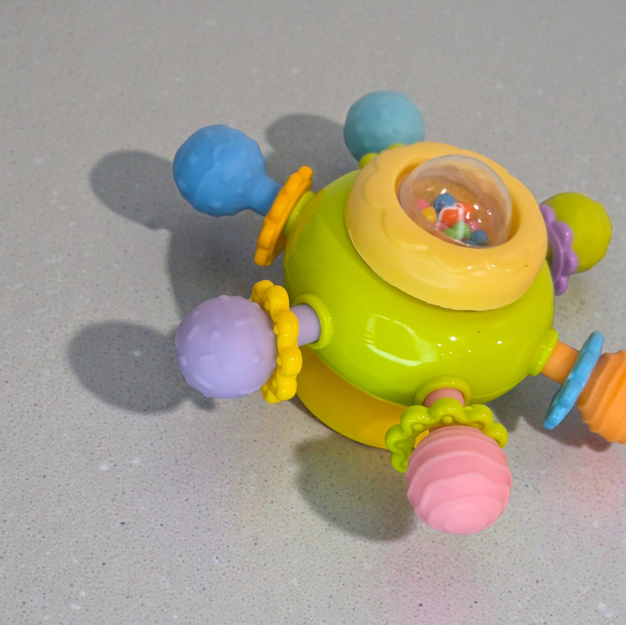 Jucăria este realizată din silicon moale, de calitate alimentară, fără BPA și ftalați, fiind sigură pentru dentiție. Piciorușele pot fi rontăite, ajutând la calmarea gingiilor sensibile, iar texturile variate stimulează simțul tactil. Sfera centrală este umplută cu bile mici care produc sunete plăcute, la fel și inelele atașate pe fiecare picioruș, contribuind la stimularea auzului și menținerea interesului copilului.