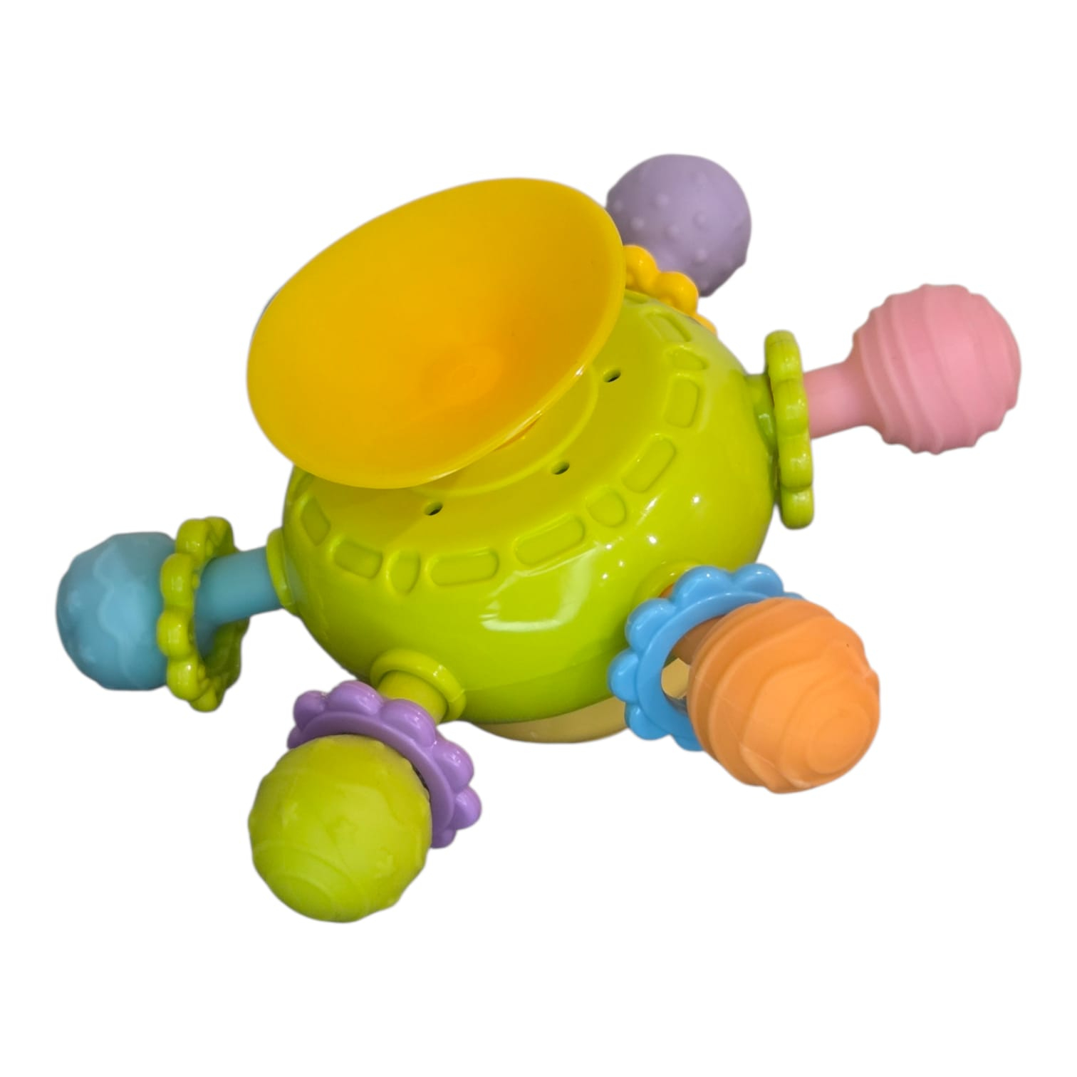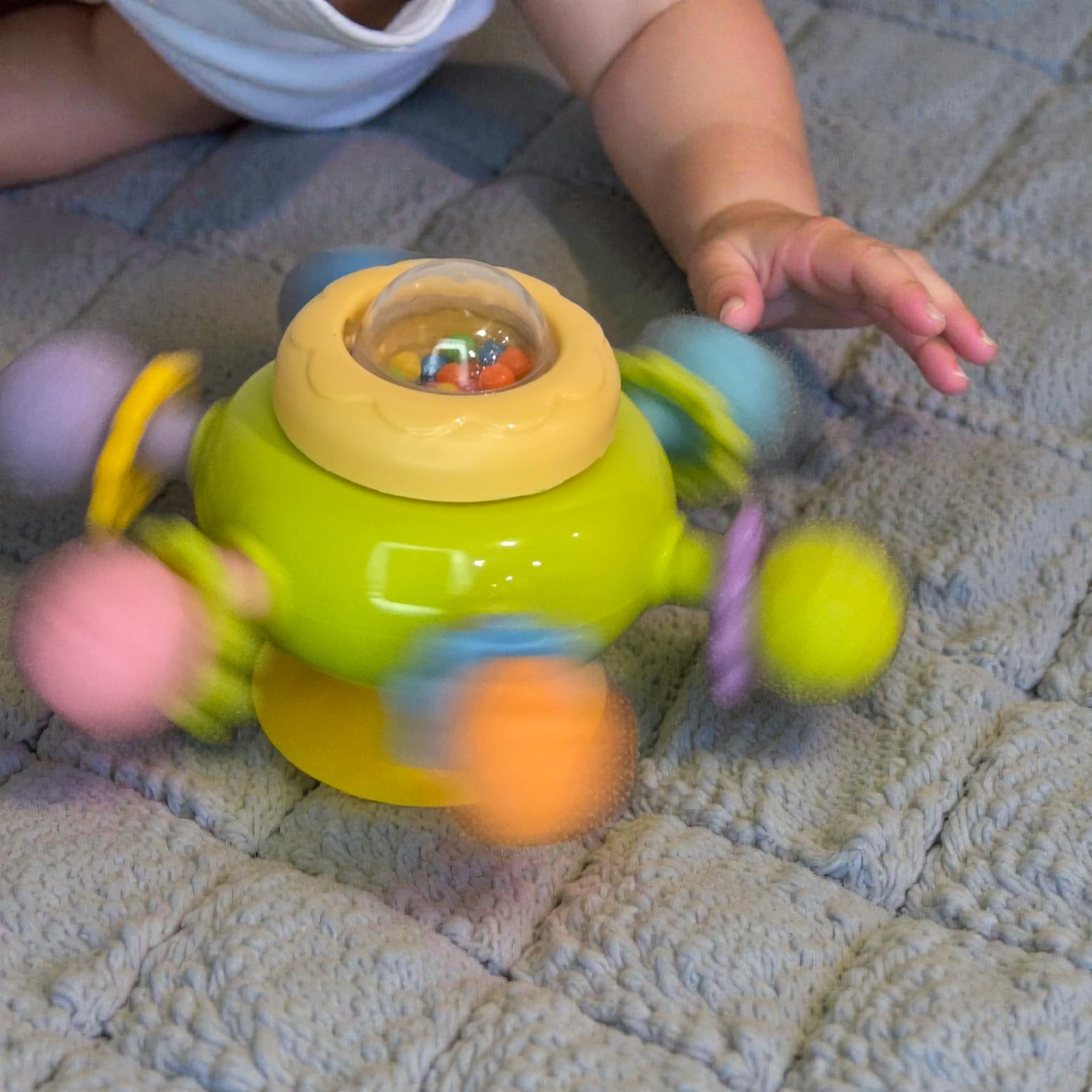 Datorită ventuzei puternice, jucăria poate fi fixată pe suprafețe netede precum masa, scaunul de masă, cada sau geamul mașinii, fiind ideală atât pentru joaca de acasă, cât și pentru deplasări. Dimensiunea compactă o face ușor de manevrat de mâinile mici și simplu de depozitat în geanta de scutece.
