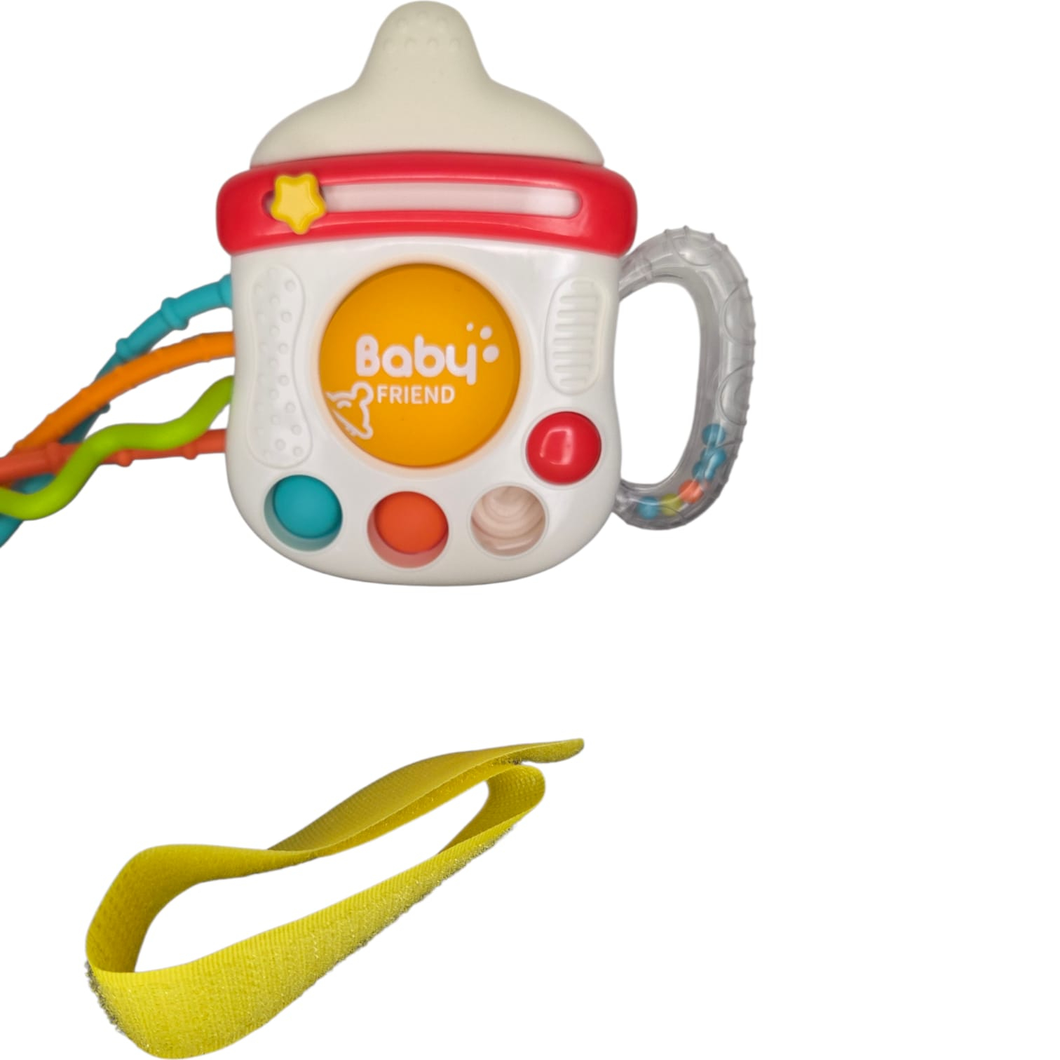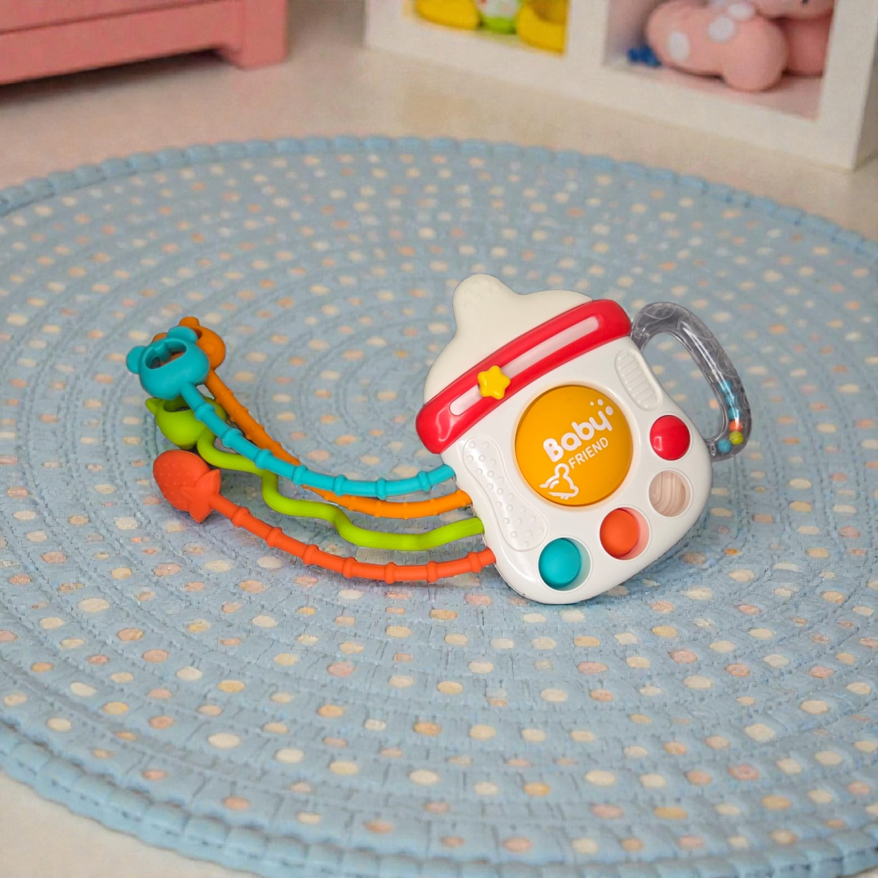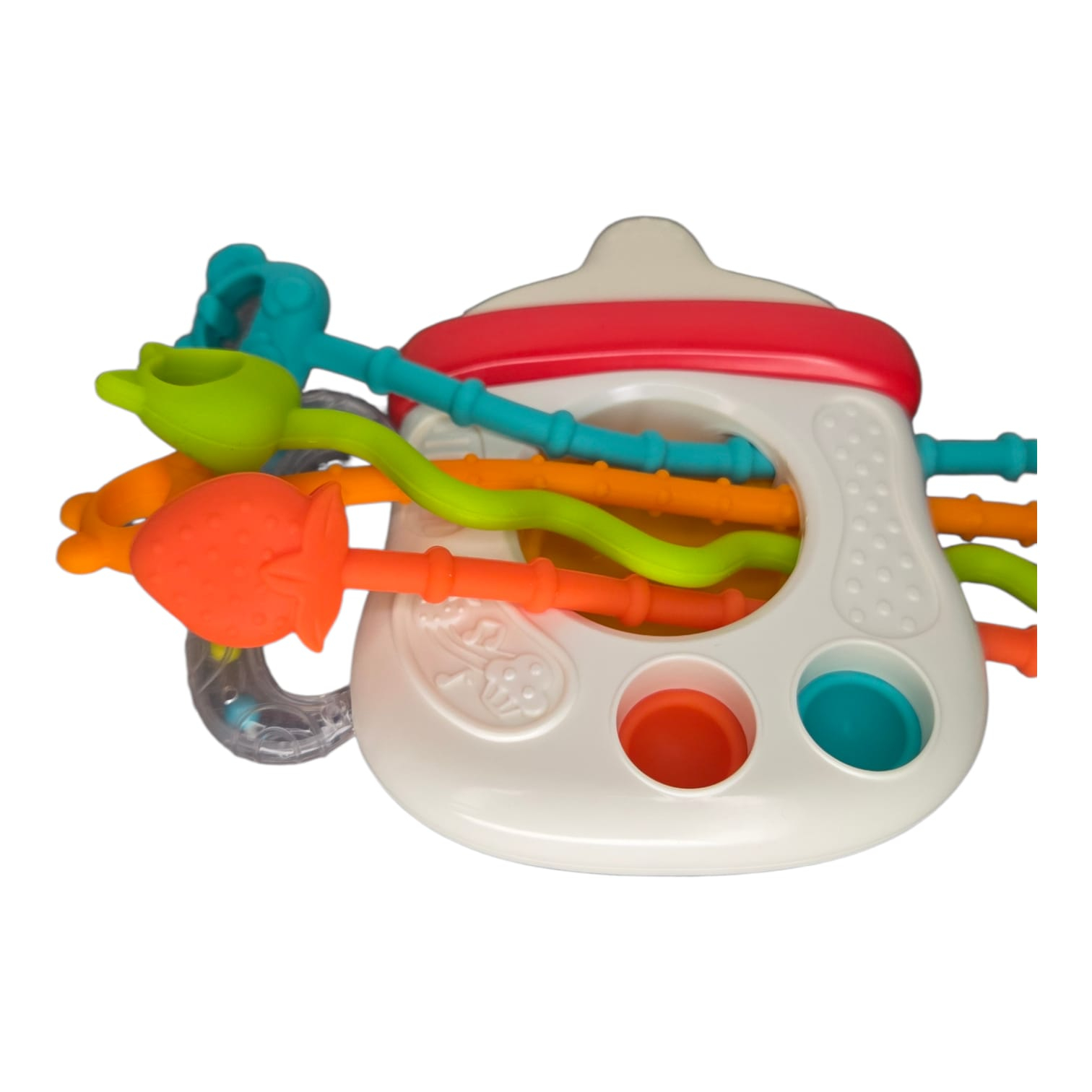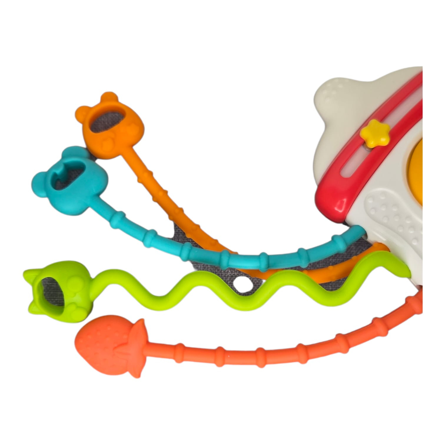 Cu șnururi colorate și texturate, butoane și forme masticabile, jucăria invită copilul la explorare prin apucare, tragere, mestecare, scuturare sau apăsare. Fiecare mișcare stimulează simțurile văzului, auzului și atingerii, transformând joaca într-o experiență educativă și relaxantă.