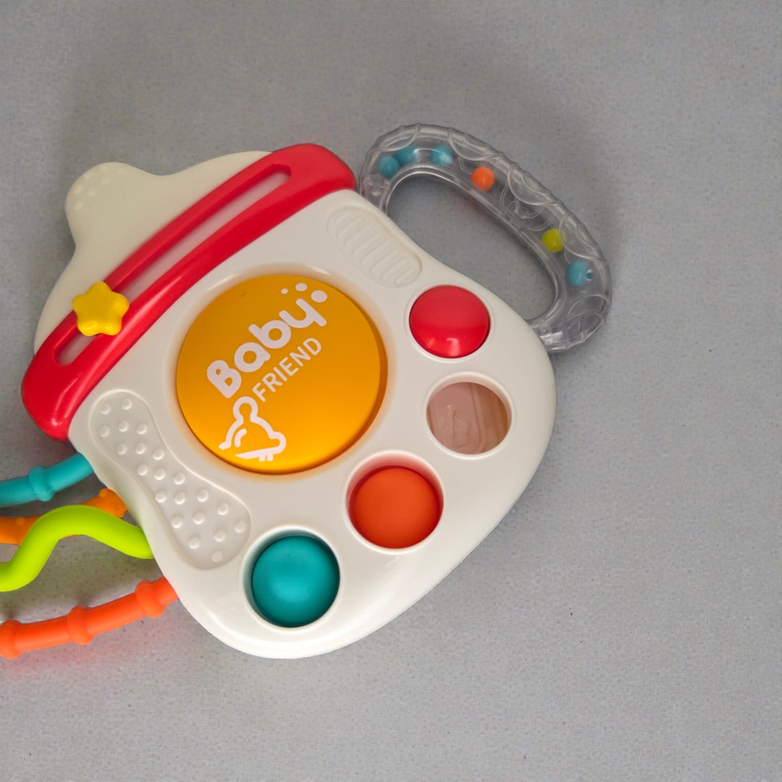 - Stimulare senzorială completă – culori vii, texturi diferite și sunete atractive.