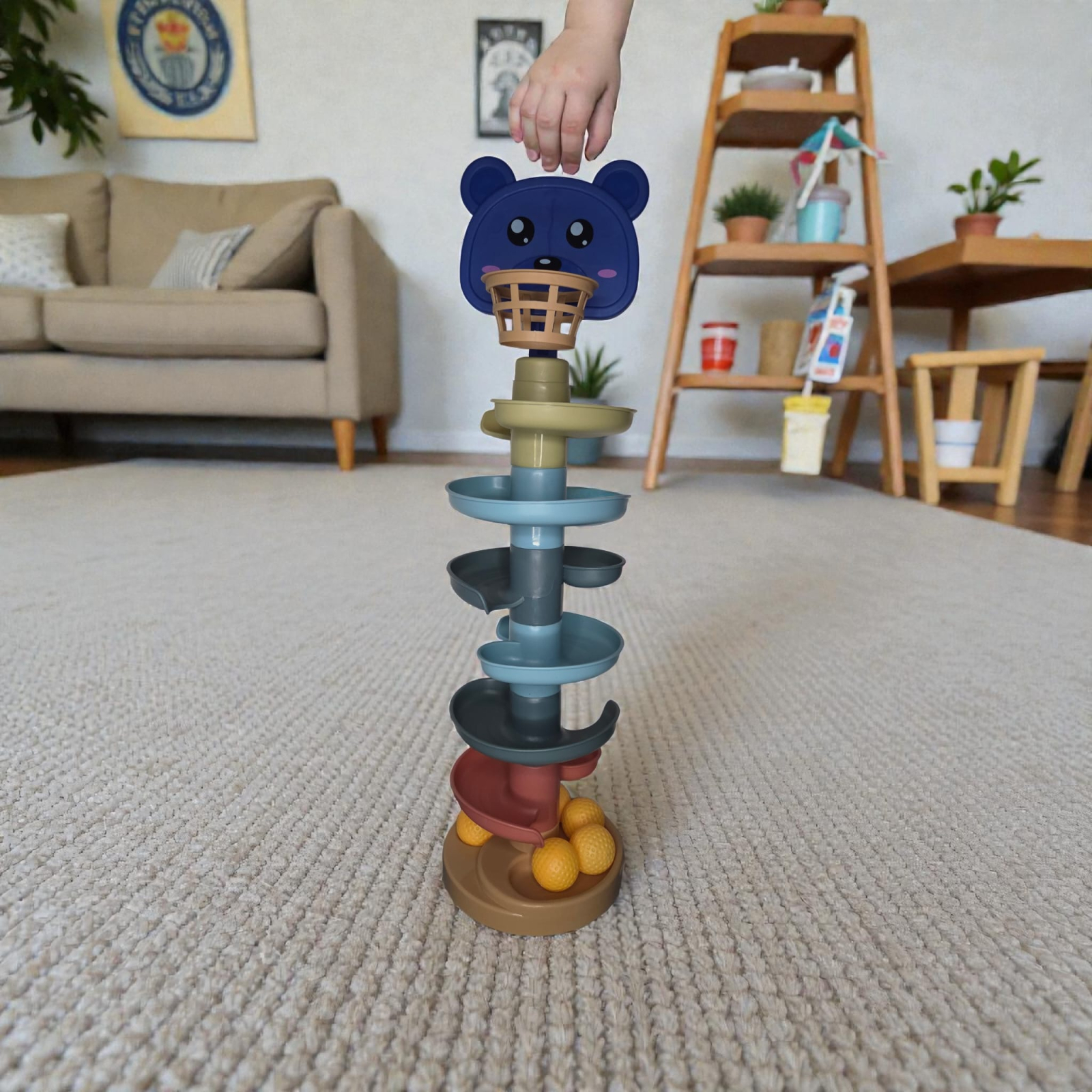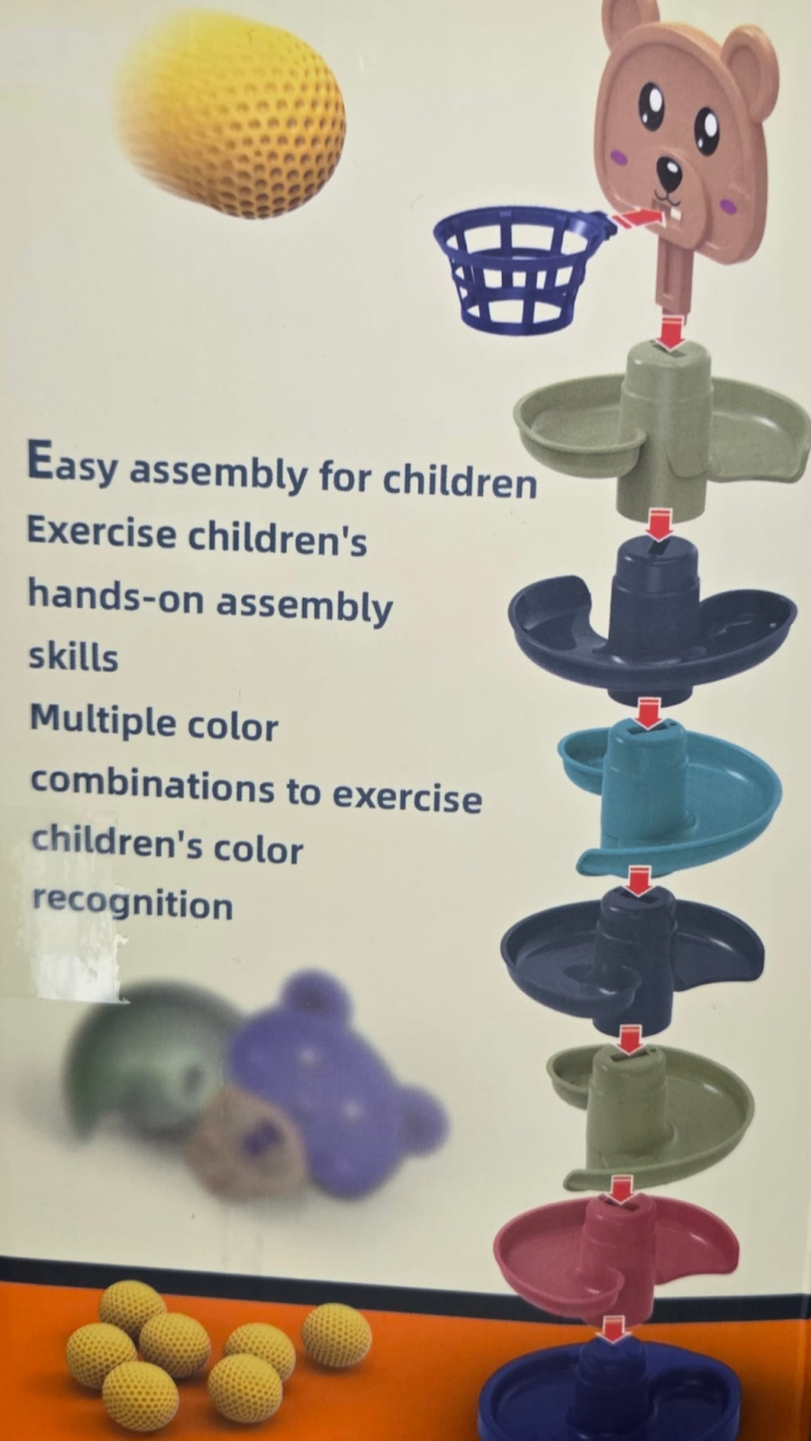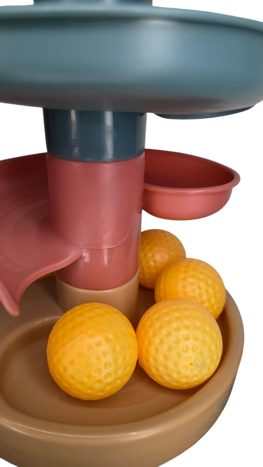 Această jucărie interactivă tip circuit cu bile este concepută pentru a stimula dezvoltarea copiilor prin joacă activă și captivantă. Având o înălțime de aproximativ 45 cm și un design format din 7 nivele suprapuse și 6 bile, jucăria oferă un traseu atractiv pe care bilele coboară succesiv până la bază.