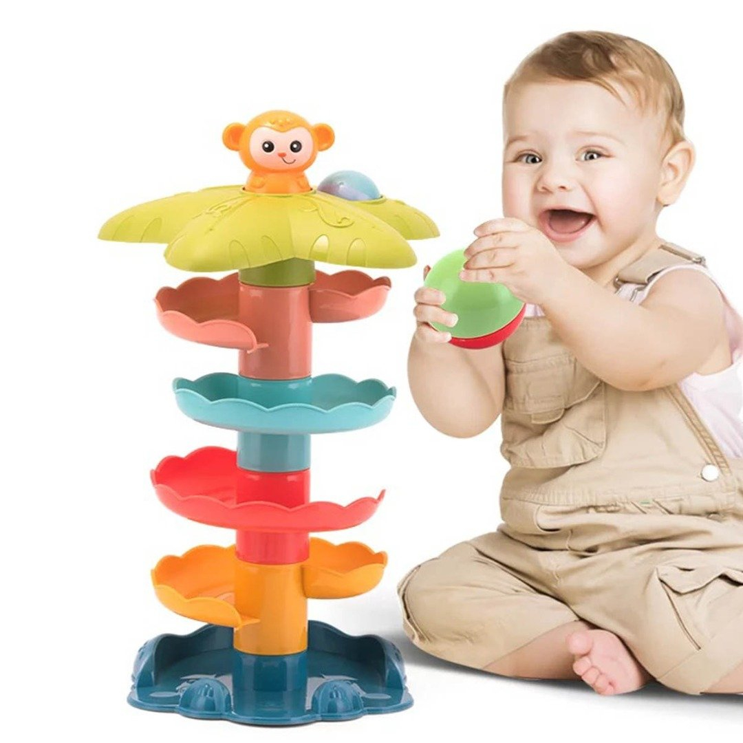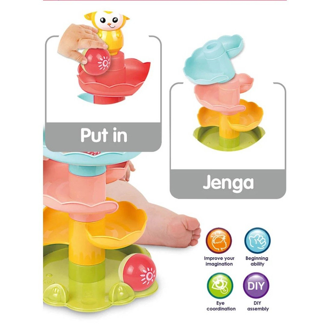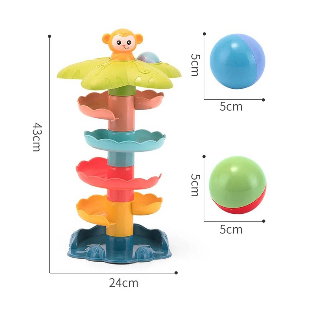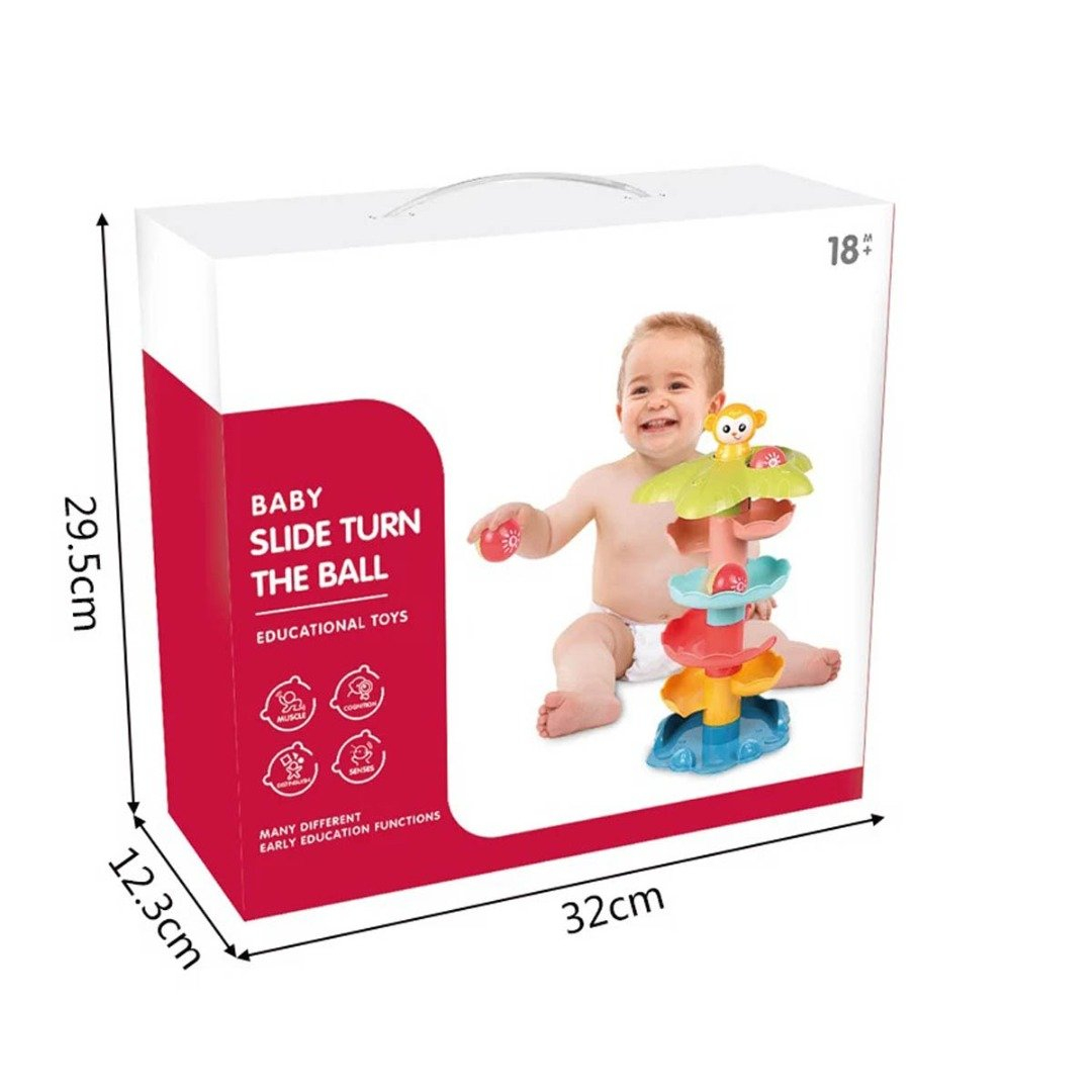 Această jucărie interactivă tip circuit cu bile este concepută pentru a stimula dezvoltarea copiilor prin joacă activă și captivantă. Având o înălțime de aproximativ 32cm și un design format din 6 nivele suprapuse, jucăria oferă un traseu atractiv pe care bilele coboară succesiv până la bază.