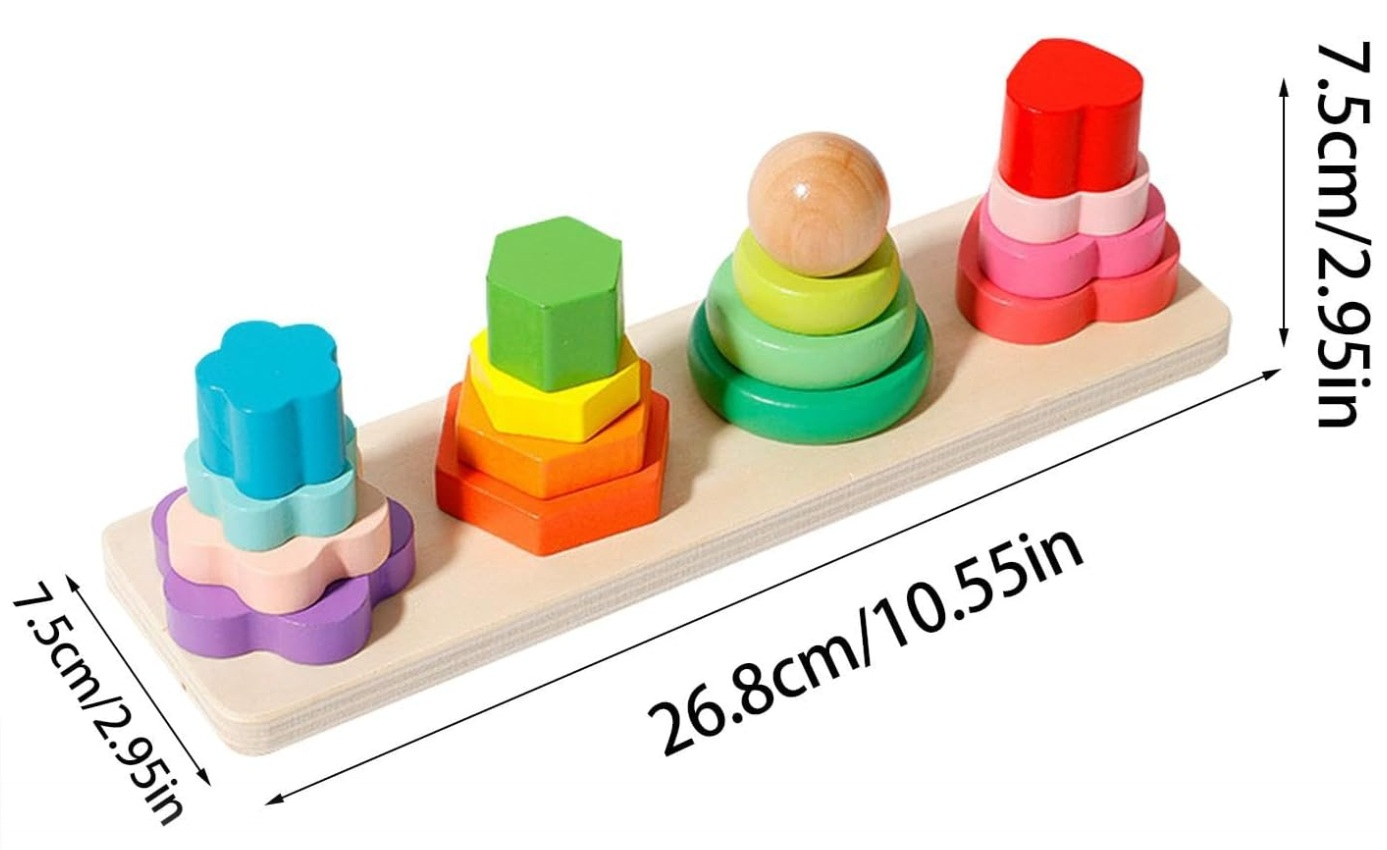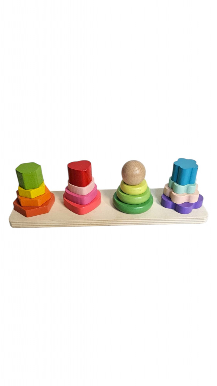 • Design multifuncțional: include patru coloane pentru stivuirea formelor geometrice de diferite dimensiuni și culori;