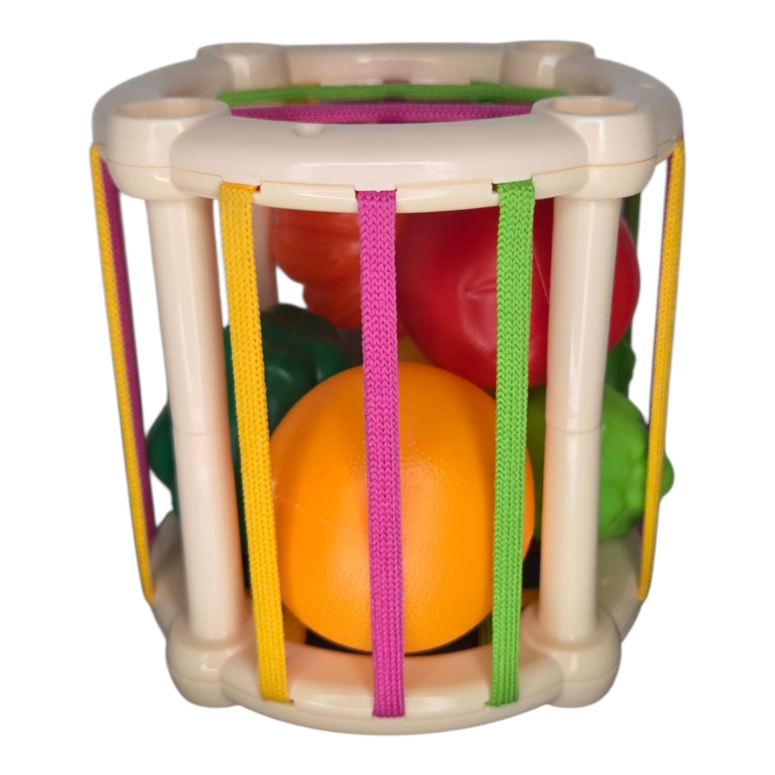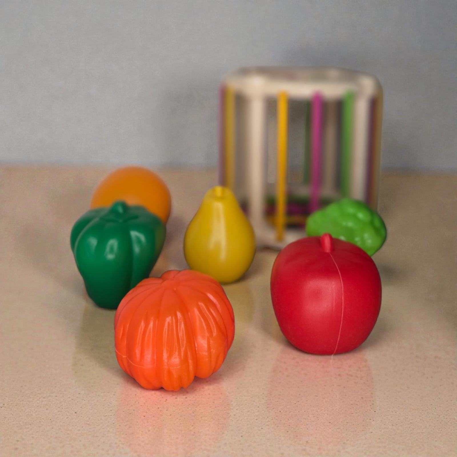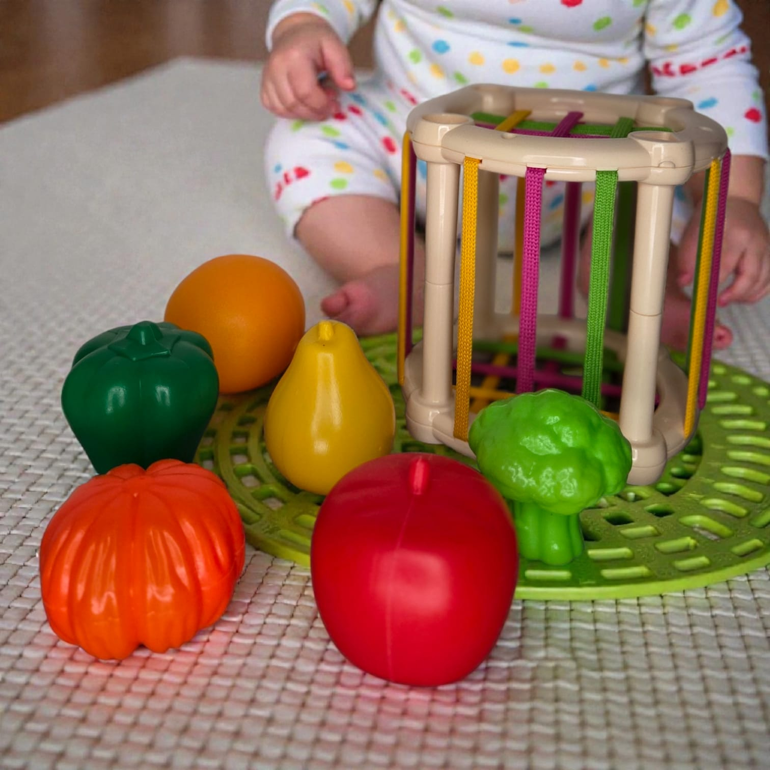 Jucăria funcționează ca un sortator flexibil, în care piesele colorate în formă de fructe și legume sunt introduse și scoase din cub prin deschideri și benzi elastice. Această activitate ajută copilul să recunoască fructele, legumele și culorile, oferind o experiență senzorială completă, bazată pe atingere, mișcare și explorare.